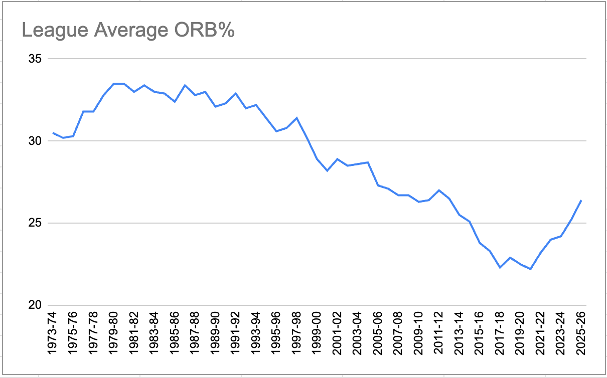 Dating back to 1973-74, the first season the NBA delineated between offensive and defensive rebounds, the 2025-26 Houston Rockets’ offensive rebound percentage of 37.9% ranks fifth out of 1,416 individual team seasons. Now, I know what you’re thinking: fifth isn’t first, and first means best, but that ignores one crucial component– the league environment.