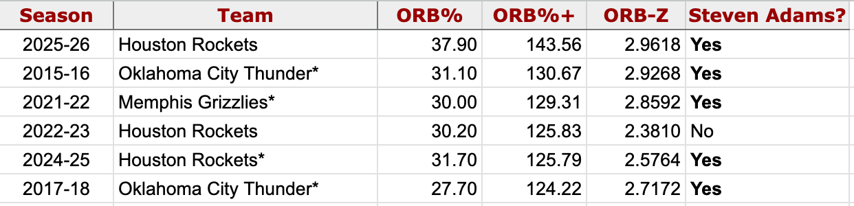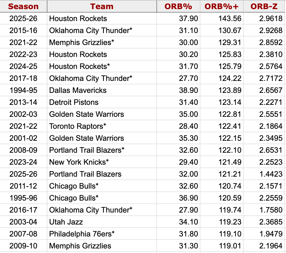 To better represent how much of an outlier the 2025-26 Rockets are, I devised two simple metrics. First, I took every team’s offensive rebound rate, divided it by that season’s league average offensive rebound rate, and then multiplied that figure by 100 to create Adjusted Offensive Rebound Rate (ORB%+). The second is simply the individual Z-score for each team’s offensive rebound rate (ORB%-Z). And in these two metrics, the 2025-26 Houston Rockets are not only first; they’re first by a significant margin.