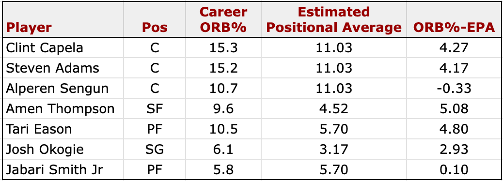 *Estimated Positional Average is the approximate positional ORB% average for the 2025-26 season