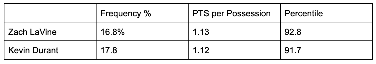 A big part of LaVine’s impressive blend of volume and efficiency has been his insane 3-point shooting (45%). However, he also has been efficient within the arc (56%), and it’s not as if he’s simply being spoon-fed layups and catch-and-shoot threes. His 3.6 isolation possessions per game rank 12th among players who have played at least 25 games, and his 1.13 points per possession rank tenth and is first among players who isolate more than 0.9 times per game. You could credibly argue that LaVine has been the best isolation player in the league this season because he has basically been Kevin Durant.