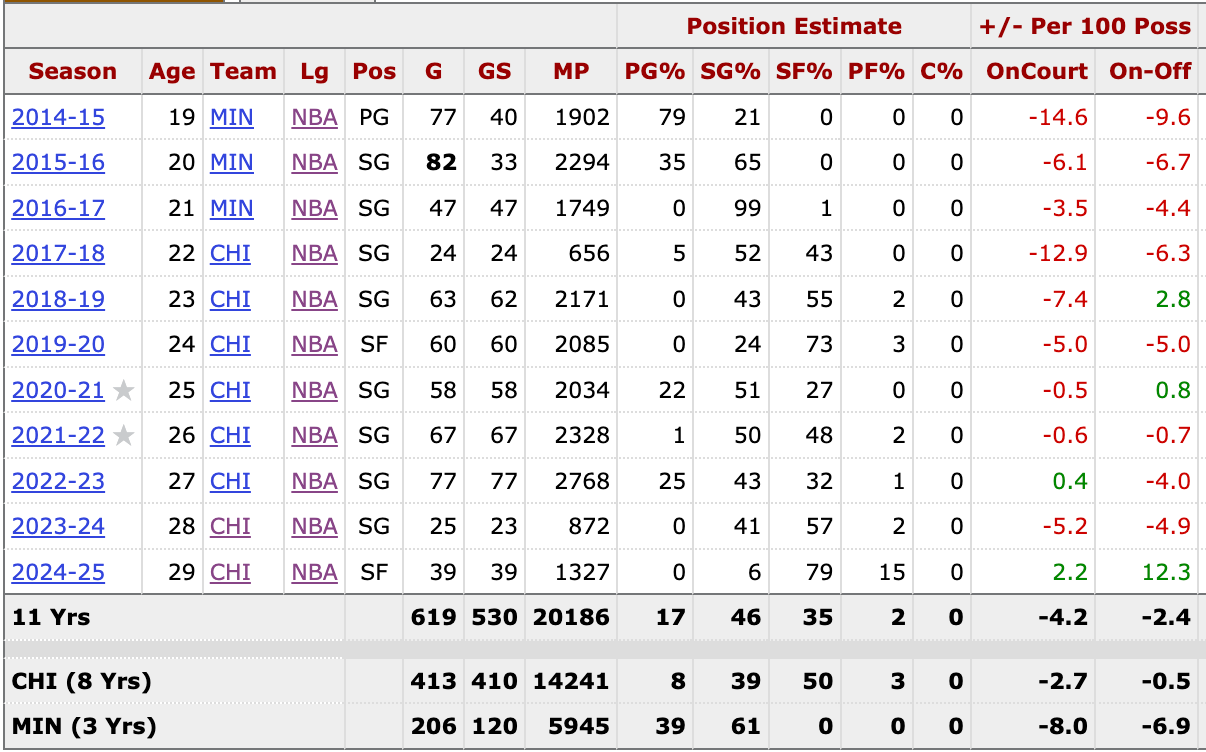 I mean, good god. What a monstrosity. It’s like peering into the butthole of the devil. However, if you look down in the right corner, you’ll see a pocket of green. After a decade of generally fulfilling the losing player archetype, LaVine has suddenly transformed into a winner. And who wouldn’t want a winning player who scores with volume and efficiency? Well, as it stands, virtually every team in the NBA.