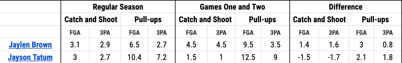 Tatum has seen both his catch and shoot opportunities decrease and his pull-up attempts increase against the Knicks, while Brown has seen his pull-up attempts increase. Brown getting more catch-and-shoot opportunities suggests the Knicks are much more keyed into stopping Tatum from getting his most efficient looks, and should his series shooting woes change, he could be in store for a big game.