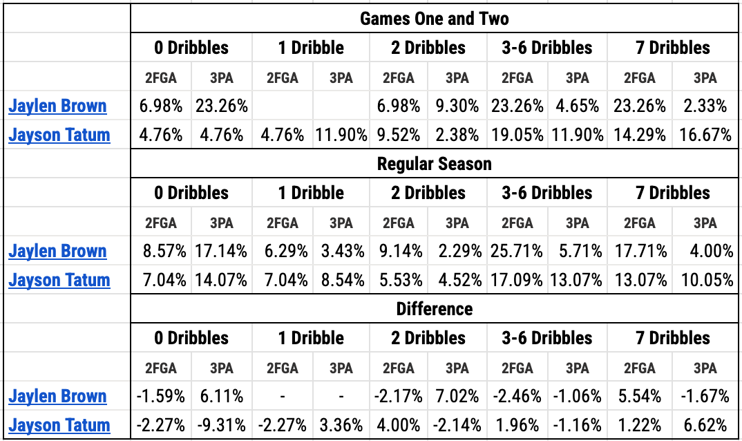 Going even deeper down the tracking rabbit hole, we can see how the Knicks are generally forcing Tatum and Brown to take more dribbles before they get a shot off. Similar to the efficiency decline from catch and shoot opportunities, the more dribbles a player takes, the more likely they are to miss the shot.