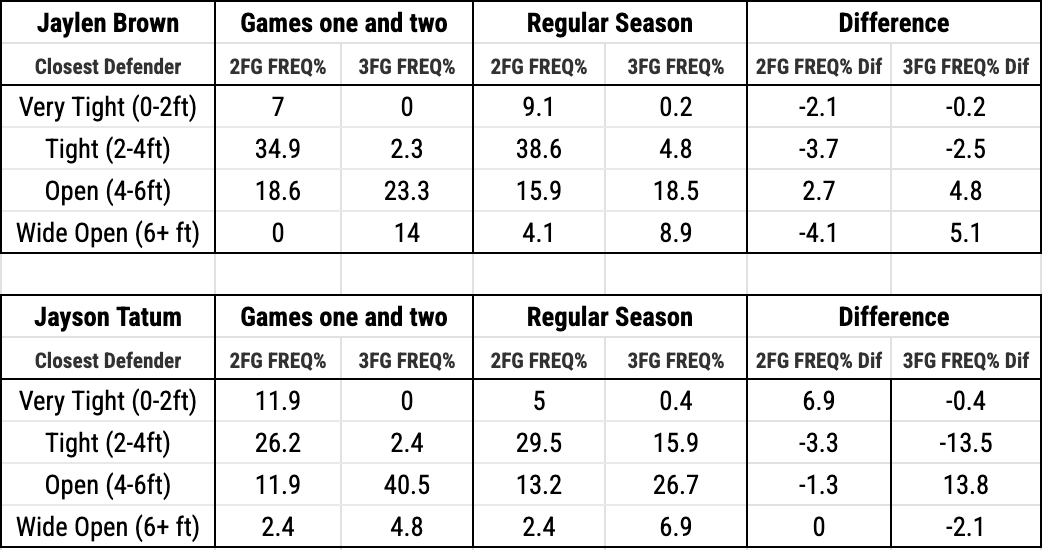 For very tight and tight, a negative number suggests improved shot quality, while for open and wide open, a positive number is better. Between the two, eleven out of the sixteen boxes have moved in the right direction in terms of shot quality, with Tatum’s increase of 13.8% on open 3-point attempts representing the largest gain. While the Knicks aren’t necessarily closing down on Tatum and Brown any more than you would expect, that doesn’t mean they aren’t defending them well. In many cases, what type of shot a player takes is just as important as how close the nearest defender is.