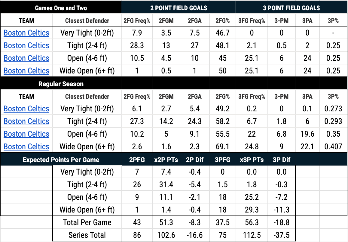 Considering the Celtics converted 36.8% of their threes during the regular season, it doesn’t take a calculator to know that if they had shot anywhere near their true talent level, they easily would be up 2-0. Using NBA.com’s closest defender tracking data, the Celtics have scored 54.104 fewer points than you would expect over their two games with the Knicks. And contrary to popular belief, the Knicks are not forcing more contested threes. In fact, 50.2% of the Celtics’ shots have either been open or wide-open threes in the series, up from 46.8% in the regular season.